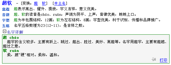2. 點擊“提交”按鈕,系統(tǒng)即可為您起出符合要求的名字。以下是候選名字“超軟”的解釋信息。