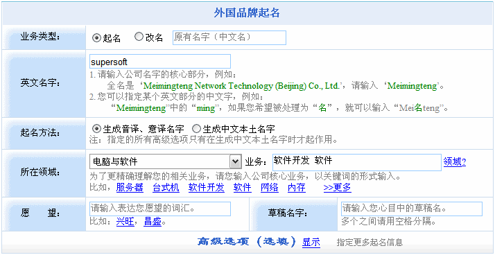 - 采用音譯、意譯混合的方式起中文名:仍然以supersoft為例,本系統(tǒng)能夠根據(jù)該英文名,起出“舒佩爾軟”、“速派爾軟”、“超索芙特”、“超索夫特”等名字。