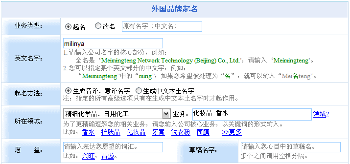 由于外國品牌起名的操作功能同品牌起名相同,因此這里不在贅述。您如果尚不熟悉,可參見“品牌起名”中的相關介紹。 |