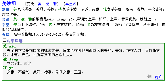 2. 點擊“提交”按鈕,系統(tǒng)即可為您起出符合要求的名字。以下是候選名字“美凌雅”的解釋信息。