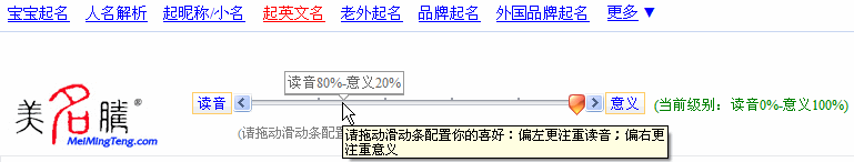 這兩種起名法,您完全可以得兼。使用美名騰起英文名系統(tǒng)提供的讀音、意義配置工具,您可以在讀音與意義之間尋找一個合適的平衡點以獲得滿意的英文名。如下圖所示。 |