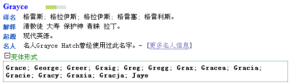 2. 點擊“提交”按鈕,系統(tǒng)即可為您起出符合要求的英文名。以下是英文名“Grayce”的解釋信息。