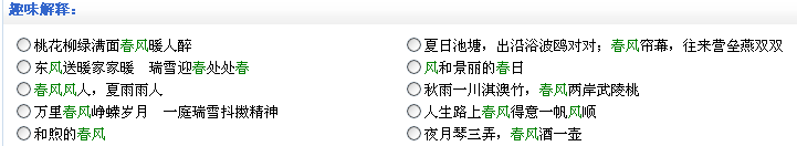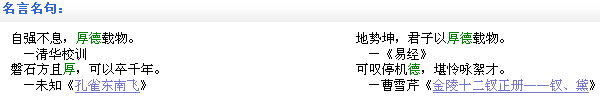 | 使用人名解析系統(tǒng),用戶可以找到一句最合適解釋自己名字的名言或趣解,方便在給別人介紹自己名字時(shí)使用,從而易于其他人記憶自己的名字。下圖分別顯示了名字“春風(fēng)”及“厚德”的趣解和名言信息。