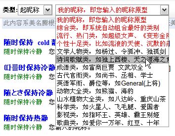 在網(wǎng)絡(luò)江湖上行走,擁有一個(gè)酷的昵稱,會增加不少點(diǎn)擊率。但是起個(gè)好昵稱并不是一件容易的事情,因?yàn)楹玫年欠Q背后往往透射著智慧和格調(diào)。美名騰起昵稱系統(tǒng)能夠讓您輕松起出超酷昵稱。起昵稱時(shí),建議您輸入全部信息,這樣美名騰起昵稱系統(tǒng)就可以根據(jù)您的信息起出與您最貼切的昵稱。此外,您還可以根據(jù)喜好,對昵稱的嚴(yán)謹(jǐn)和詼諧程度進(jìn)行控制。下面兩幅圖分別顯示了使用類別起昵稱及控制嚴(yán)謹(jǐn)、詼諧程度的過程。