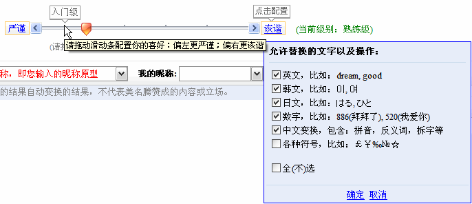 - 起昵稱系統(tǒng)創(chuàng)造性地將嚴(yán)謹(jǐn)與詼諧兩種起昵稱風(fēng)格進(jìn)行了有機(jī)融合。用戶可以拖動滑動條以配置嚴(yán)謹(jǐn)與詼諧這兩種風(fēng)格的平衡。